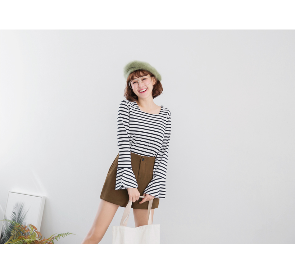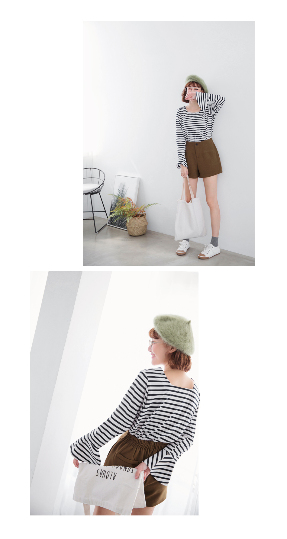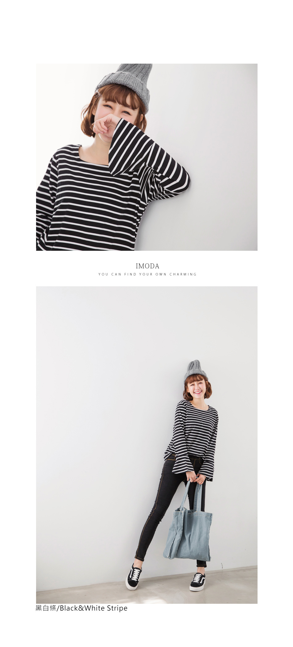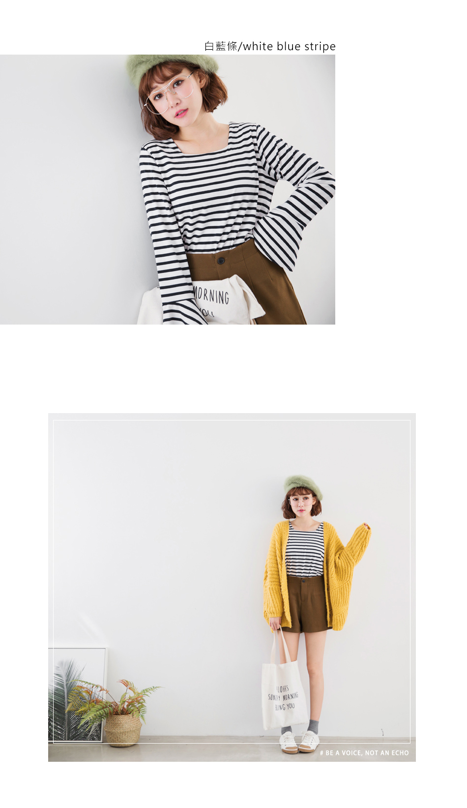 實搭的條紋搭配喇叭袖及船型領的剪裁,打造休閒風的甜美感~