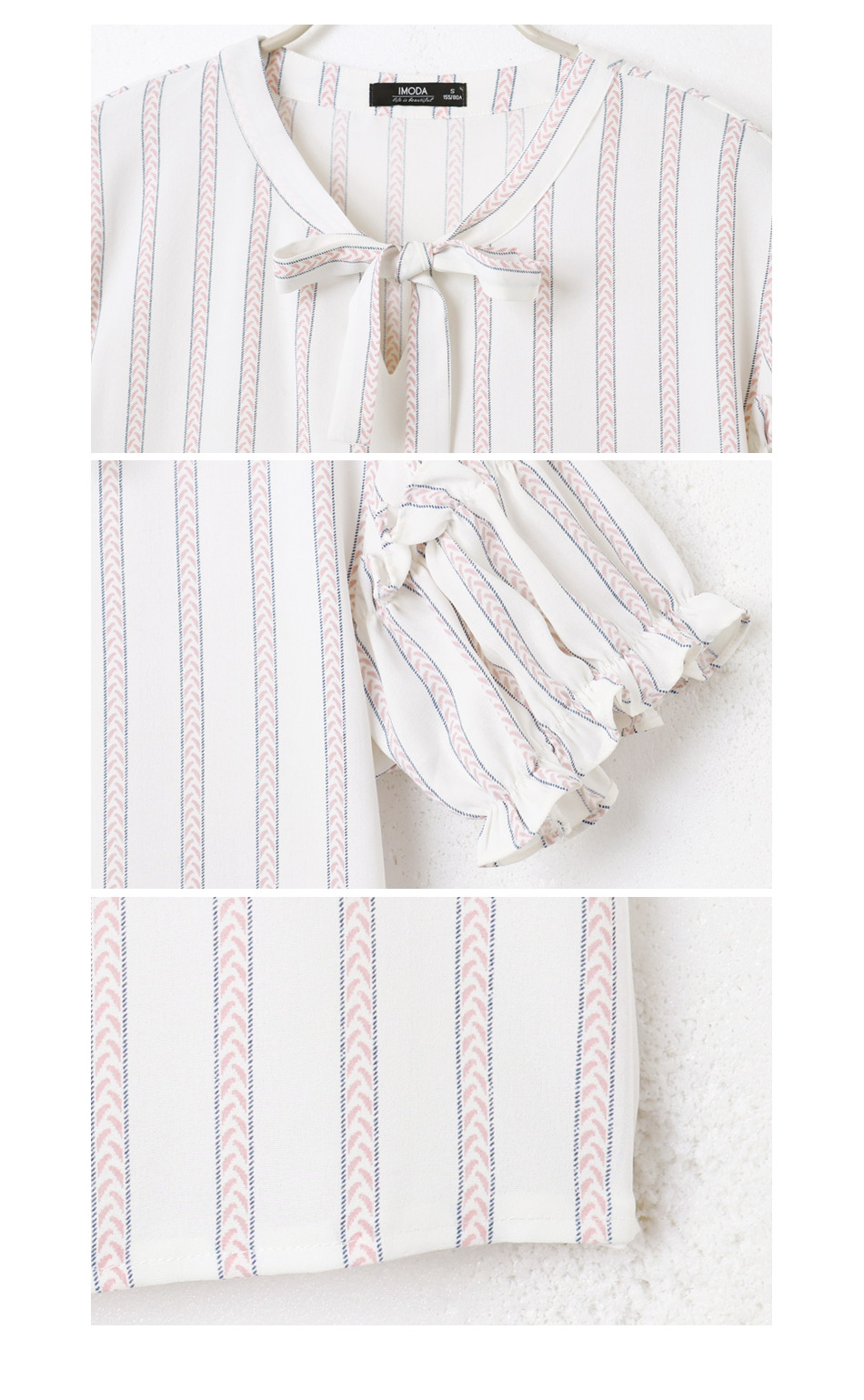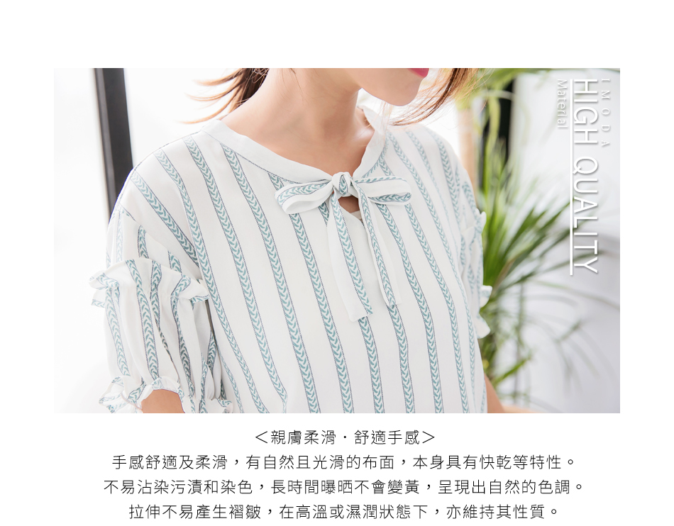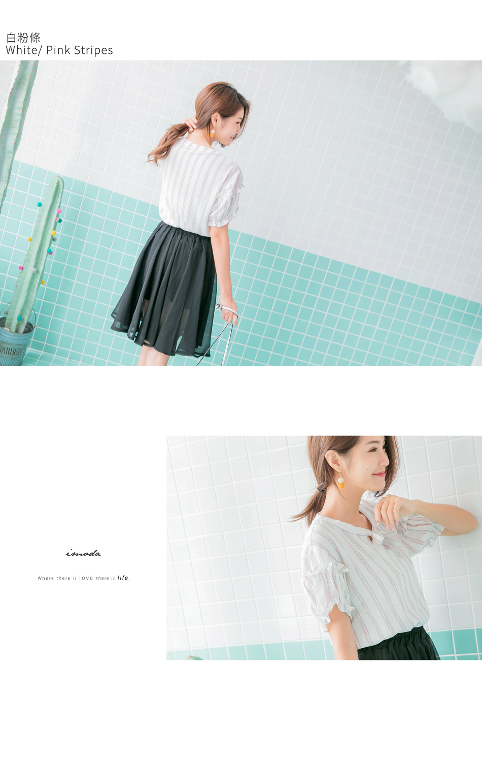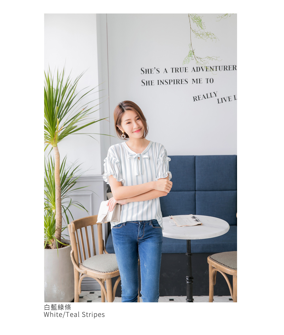 直條紋搭配裡面可愛的紋路, 營造日系女孩的迷人氣息~ 領前綁帶增添知性優雅, 荷葉滾邊的拋袖設計展現時髦甜美的設計感~ ********************** 小提醒:綁帶可調 深色衣物建議單獨 售價:349
